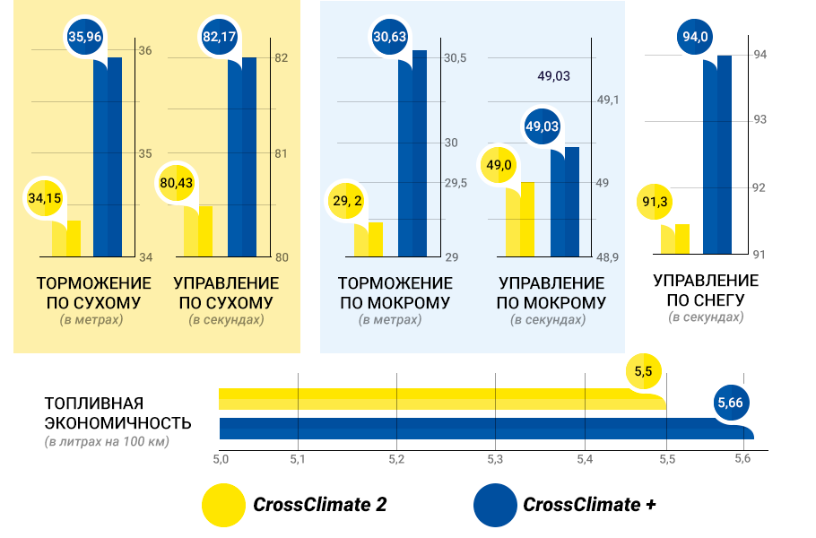На обычной дороге CrossClimate 2 показала немного лучшие показатели торможения, на 10% меньшее сопротивление качению, незначительное преимущество акустических параметров. Если на сухой дороге разница между моделями была незначительной, то на заснеженном покрытии различие было.